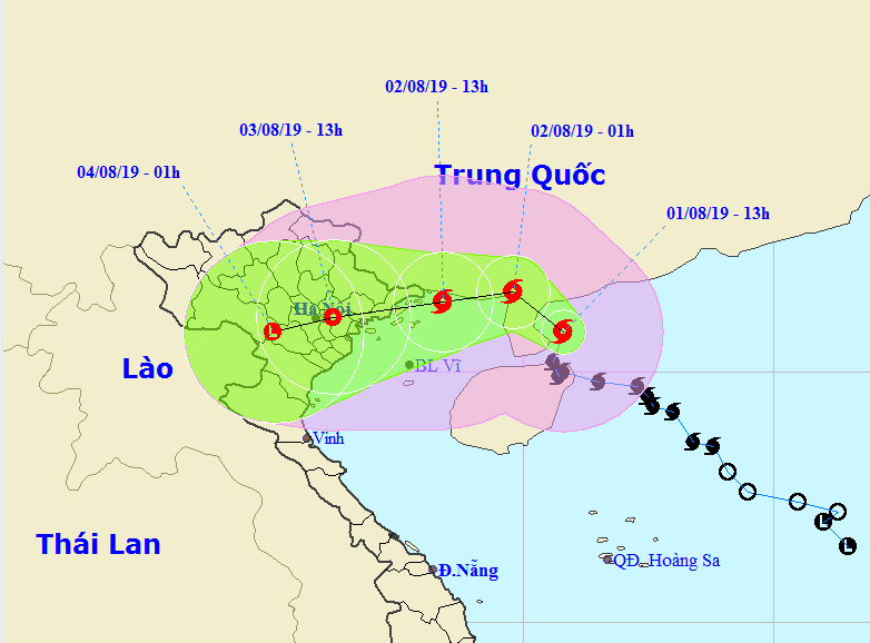 Khu vực Hà Nội: Có mưa, từ chiều và đêm mai (02/8) có mưa to đến rất to (lượng mưa phổ biến 100-200mm/đợt, có nơi trên 250mm), từ chiều tối mai có gió mạnh dần lên cấp 5, giật cấp 6-7.
