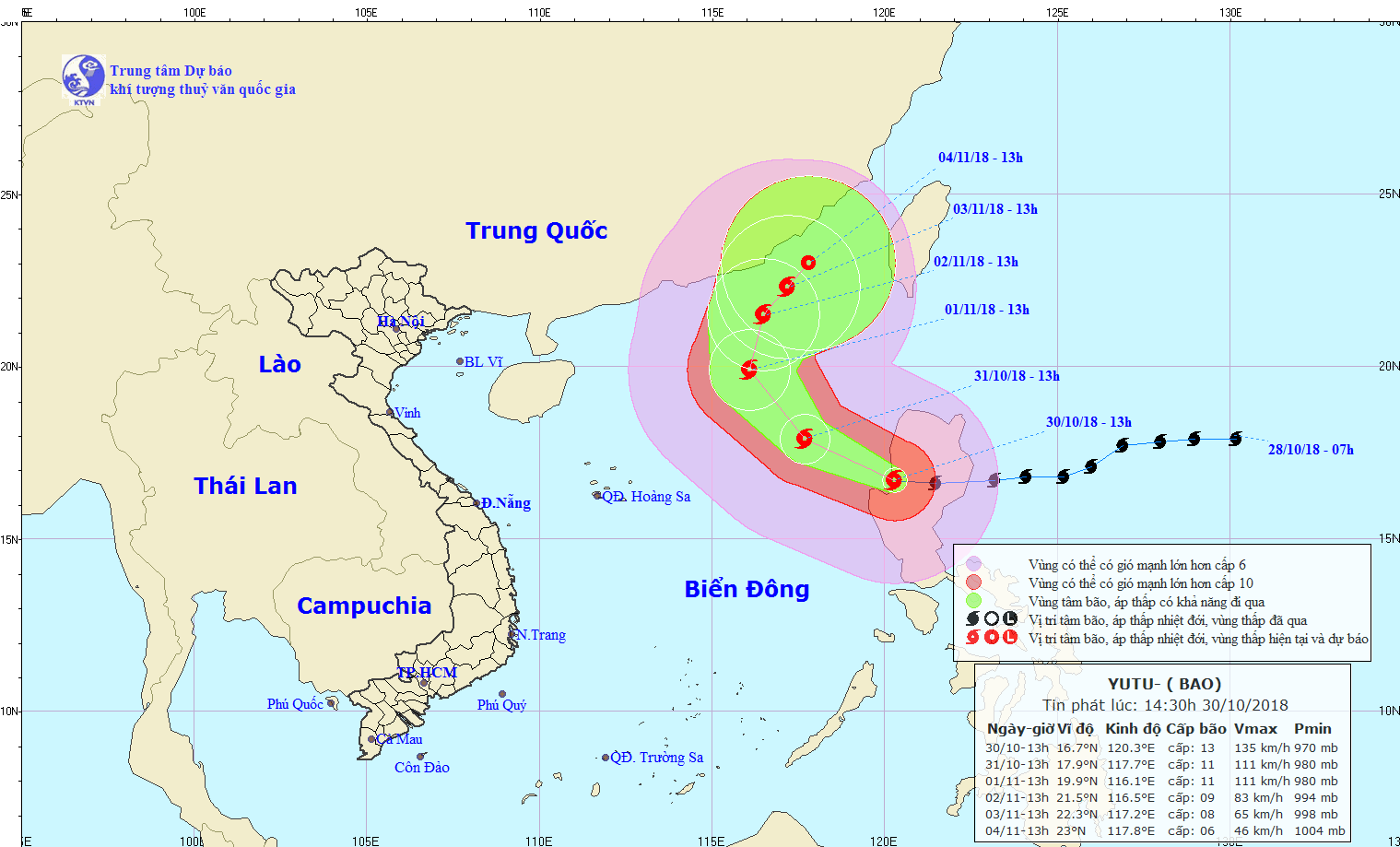Hồi 13 giờ ngày 30/10, vị trí tâm bão ở vào khoảng 16,7 độ Vĩ Bắc; 120,3 độ Kinh Đông, ngay trên bờ biển phía Tây đảo Lu-Dông (Phi-líp-pin). Sức gió mạnh nhất vùng gần tâm bão mạnh cấp 12-13 (115-150km/giờ), giật cấp 15. Phạm vi gió mạnh cấp 6, giật cấp 8 trở lên khoảng 290km tính từ vùng tâm bão; Phạm vi gió mạnh cấp 10 trở lên khoảng 90km tính từ vùng tâm bão.