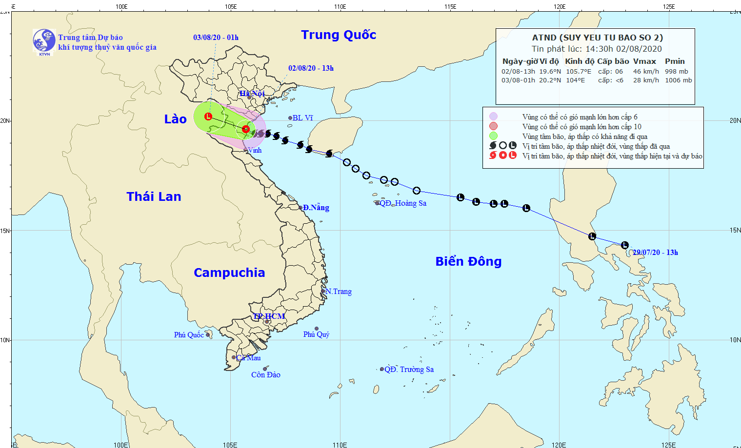 Đầu giờ chiều nay (02/8), bão số 2 đã suy yếu thành áp thấp nhiệt đới và đi vào các tỉnh Ninh Bình-Thanh Hóa. Do ảnh hưởng của bão, ở Hòn Dáu đã quan trắc được gió mạnh cấp 8, giật cấp 10; ở trạm Văn Lý có gió mạnh cấp 8, giật cấp 9. Trên đất liền ven biển các tỉnh đồng bằng Bắc Bộ và Bắc Trung Bộ có gió giật mạnh cấp 6-7.