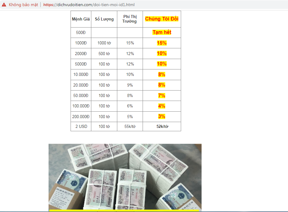 Theo quảng cáo trên các trang như "Đổi tiền mới"; "Đổi tiền lẻ giá rẻ", "Shop tiền lì xì tết"..., khách chỉ cần báo số lượng, muốn đổi bao nhiêu cũng có. Chỉ cần ngồi ở nhà, bấm điện thoại là sẽ có người đến tận nơi đổi trả, phục vụ tận tình.