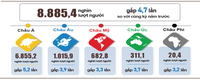 Lượng du khách quốc tế đến Việt Nam chủ yếu đến từ khu vực châu Á với hơn 6,8 triệu lượt, tiếp theo là khách từ châu Âu với hơn 1 triệu lượt và thị trường châu Mỹ với 682.000 lượt khách.