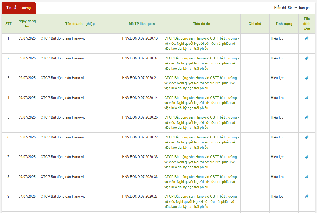 Thông tin từ Sở Giao dịch Chứng khoán Hà Nội (HNX), Công ty CP Bất động sản Hano-Vid công bố thông tin bất thường liên quan đến 26 lô trái phiếu gồm: HNV.BOND.07.2020.13; HNV.BOND.07.2020.37; HNV.BOND.07.2020.21; HNV.BOND.07.2020.14; HNV.BOND.07.2020.26; HNV.BOND.07.2020.22; HNV.BOND.07.2020.38; HNV.BOND.07.2020.36; HNV.BOND.07.2020.27; HNV.BOND.07.2020.19; HNV.BOND.07.2020.08; HNV.BOND.07.2020.04; HNV.BOND.07.2020.01; HNV.BOND.07.2020.12; HNV.BOND.07.2020.24; HNV.BOND.07.2020.20; HNV.BOND.07.2020.17; HNV.BOND.07.2020.16; HNV.BOND.07.2020.03; HNV.BOND.07.2020.18; HNV.BOND.07.2020.11; HNV.BOND.07.2020.09; HNV.BOND.07.2020.07; HNV.BOND.07.2020.02; HNV.BOND.07.2020.06; HNV.BOND.07.2020.05