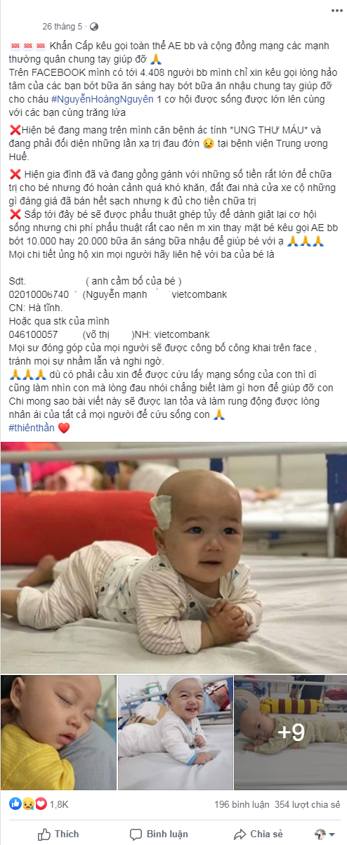 Chỉ cần một bức ảnh ghê sợ của người bệnh vừa đăng lên, là trong tích-tắc tràn ngập trên mạng xã hội Facebook vì mọi người chia sẻ. Điều đấy chẳng những làm cho người bệnh đau khổ về mặt thể xác mà tình thần cũng hoang mang. Thêm vào đó vô tình khiến cho kẻ xấu bắt gặp và trục lợi. Vì vậy mọi người nên lưu ý, làm từ thiện là một việc tốt nhưng rất cần tuân thủ theo pháp luật và hiểu tâm lý của người bệnh.