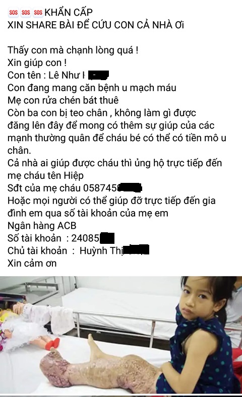 Hình ảnh ghê sợ, nhạy cảm được đăng tải để kêu gọi từ thiện trên facebook.