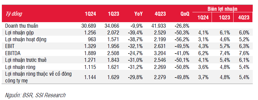 Theo SSI Research, sản lượng tiêu thụ quý 1/2024 giảm 10% đạt 1,52 triệu tấn do nhà máy lọc dầu tạm dừng hoạt động, khiến sản lượng sản xuất giảm 10% về 1,57 triệu tấn. Mặc dù BSR đã hoàn nhập 250 tỷ đồng dự phòng hàng tồn kho trong quý 1/2024 do giá dầu cao hơn, biên lợi nhuận gộp vẫn giảm 2 điểm phần trăm so với cùng kỳ và so với quý trước xuống mức 4% do sản lượng tiêu thụ giảm khiến chi phí cố định/tấn cao hơn, và đặc biệt là crack spread thấp hơn, trung bình khoảng 15,50 USD/thùng (-20% so với cùng kỳ).