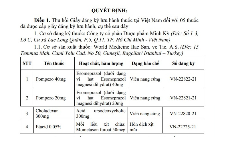 Trước đó, ngày 30/5/2022, Cục Quản lý dược đã ra quyết định số 291/QĐ-QLD về việc thu hồi Giấy đăng ký lưu hành thuốc tại Việt Nam đối với 4 loại thuốc do Công ty CP Dược phẩm Minh Kỳ đăng ký.