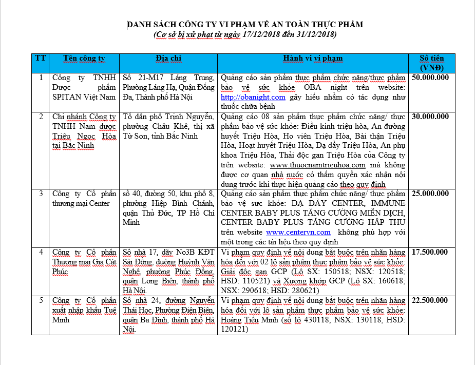 DANH SÁCH CÔNG TY VI PHẠM VỀ AN TOÀN THỰC PHẨM (Cơ sở bị xử phạt từ ngày 17/12/2018 đến 31/12/2018)