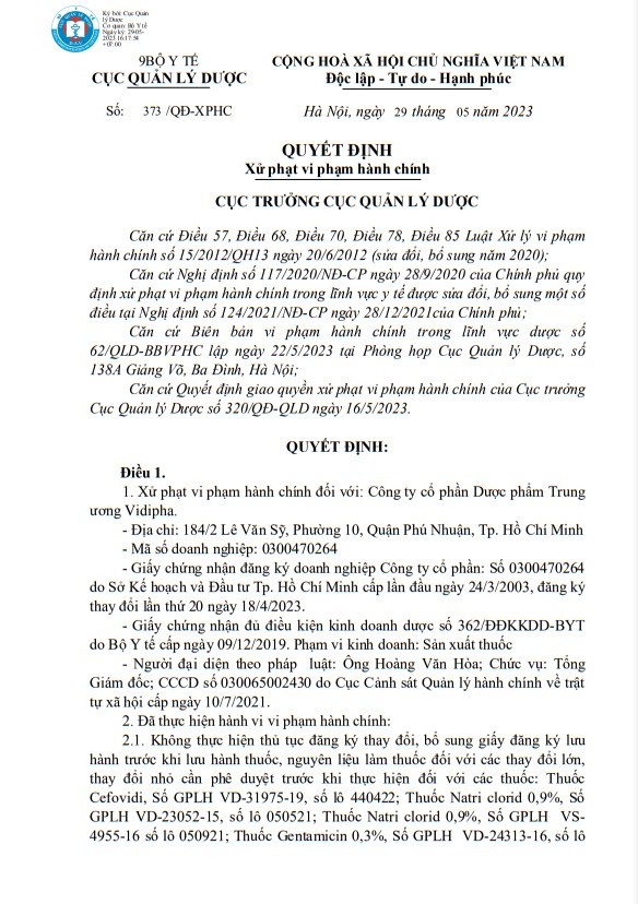 Cục Quản lý Dược (Bộ Y tế) đã ra quyết định số 373/QĐ-XPH, xử phạt vi phạm hành chính đối với Công ty cổ phần Dược phẩm Trung ương Vidipha (địa chỉ: 184/2 Lê Văn Sỹ, Phường 10, Quận Phú Nhuận, Tp. Hồ Chí Minh). Người đại diện theo pháp luật là Ông Hoàng Văn Hòa, Tổng giám đốc Công ty cổ phần Dược phẩm Trung ương Vidipha.