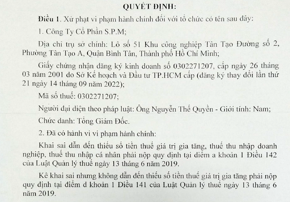Theo quyết định số 217/QĐ-CT ngày 18/01/2023 của Cục Thuế TP Hồ Chí Minh, SPM đã có hành vi khai sai dẫn đến thiếu số tiền thuế giá trị gia tăng, thuế thu nhập doanh nghiệp, thuế thu nhập cá nhân phải nộp theo quy định.