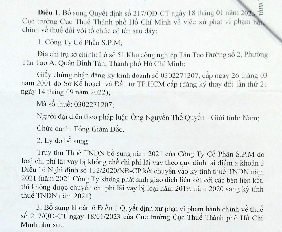 Ngày 6/4/2023, Cục thuế thành phố Hồ Chí Minh tiếp tục ban hành quyết định 700/QĐ-CT bổ sung truy thu thuế TNDN năm 2021 do loại chi phí lãi vay bị khống chế chi phí lãi vay theo quy định kết chuyển vào kỳ tính thuế TNDN năm 2021 (năm 2021 SPM không phát sinh giao dịch liên kết với các bên liên kết, thì không được chuyển chi phí lãi vay bị loại năm 2019, năm 2020 sang kỳ tính thuế TNDN năm 2021.