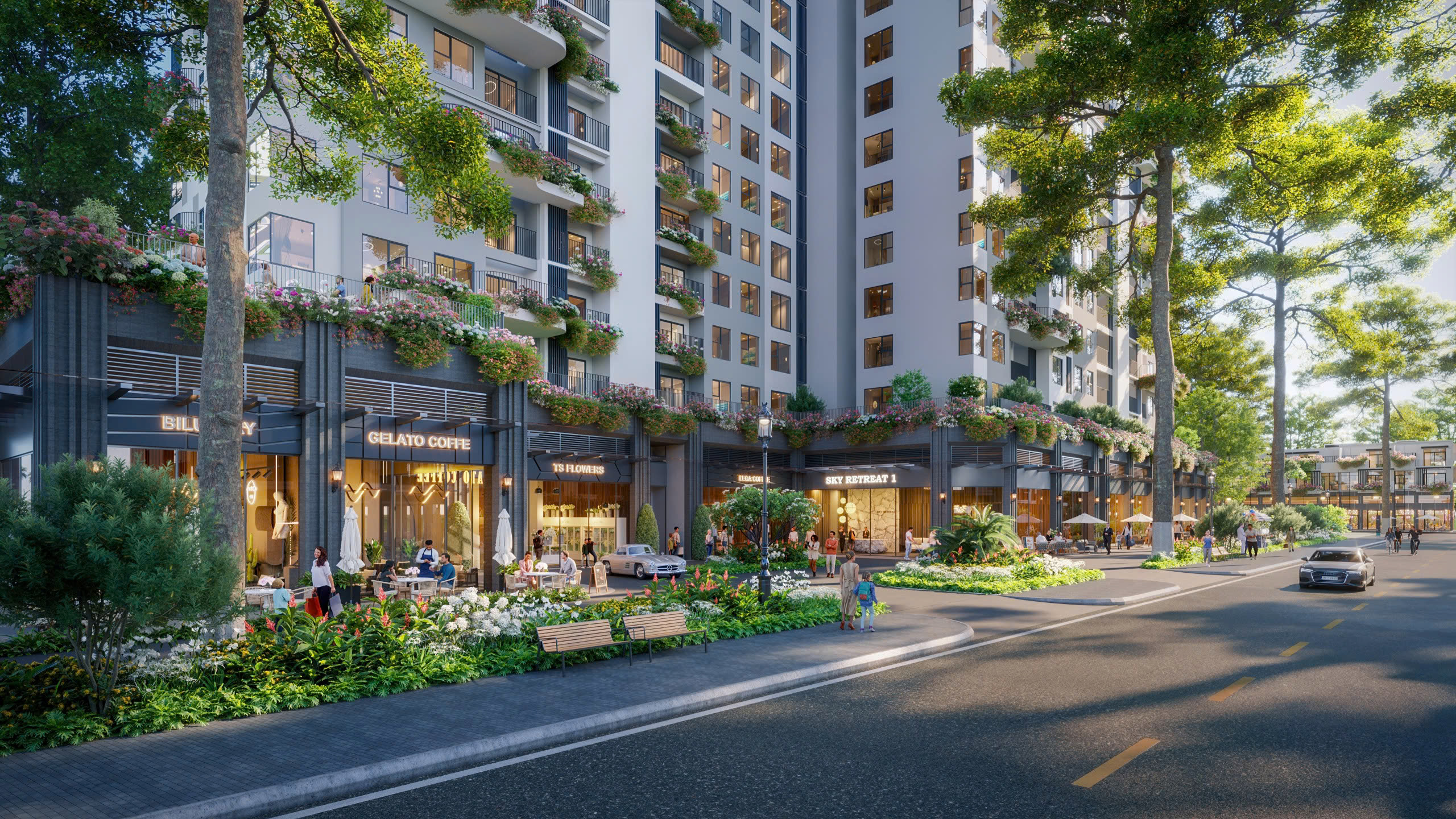 Không chỉ là nơi cung cấp dịch vụ thương mại dành cho cư dân, các shop thương mại khối đế tại Sky Retreat được thiết kế theo concept "shopping giữa rừng retreat", giúp việc mua sắm của cư dân, du khách có thêm trải nghiệm khác biệt, như những cuộc dạo chơi trong rừng giữa 4 triệu cây, hoa từ 300 chủng loại khác nhau, tạo thành 8 tầng thiên nhiên.