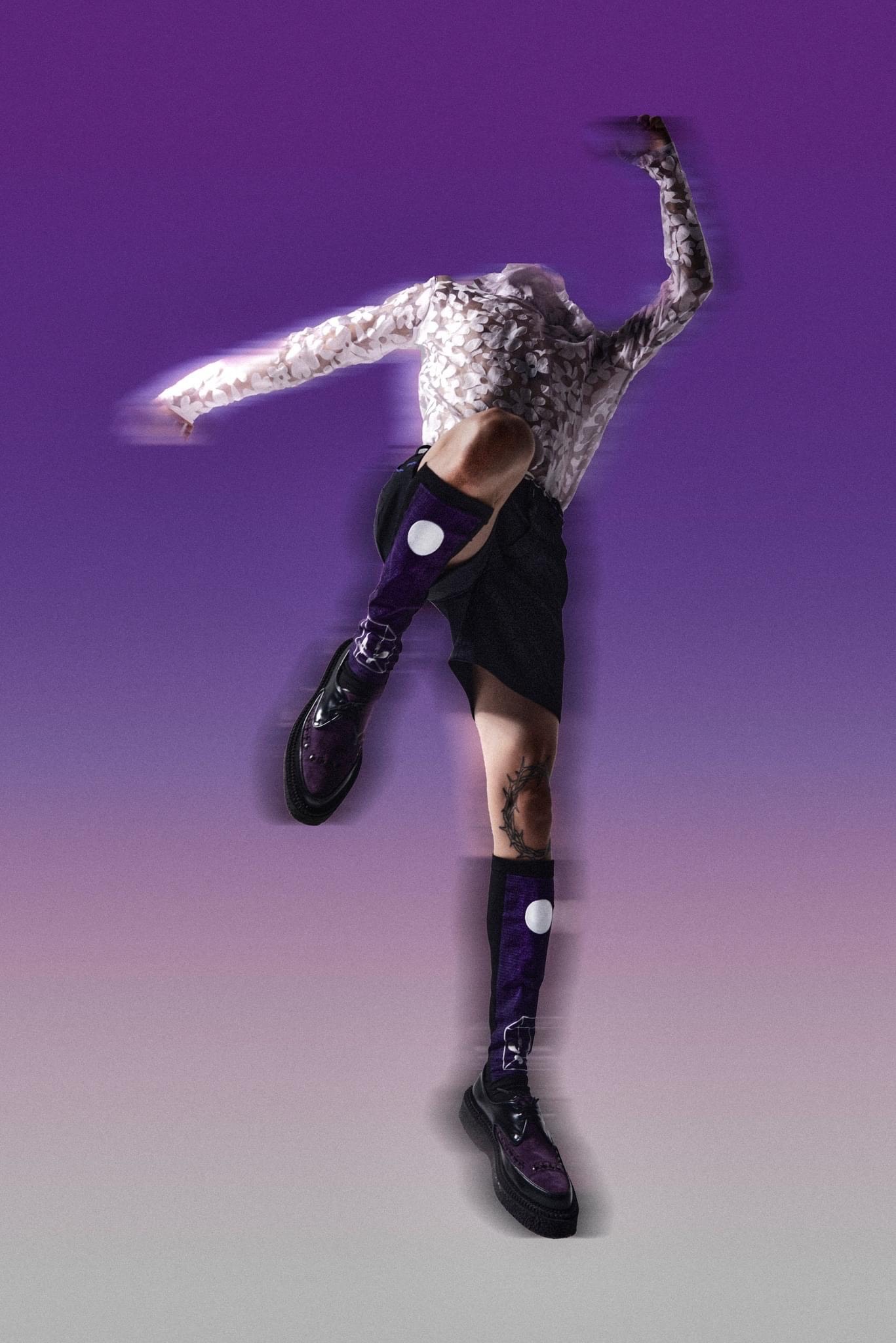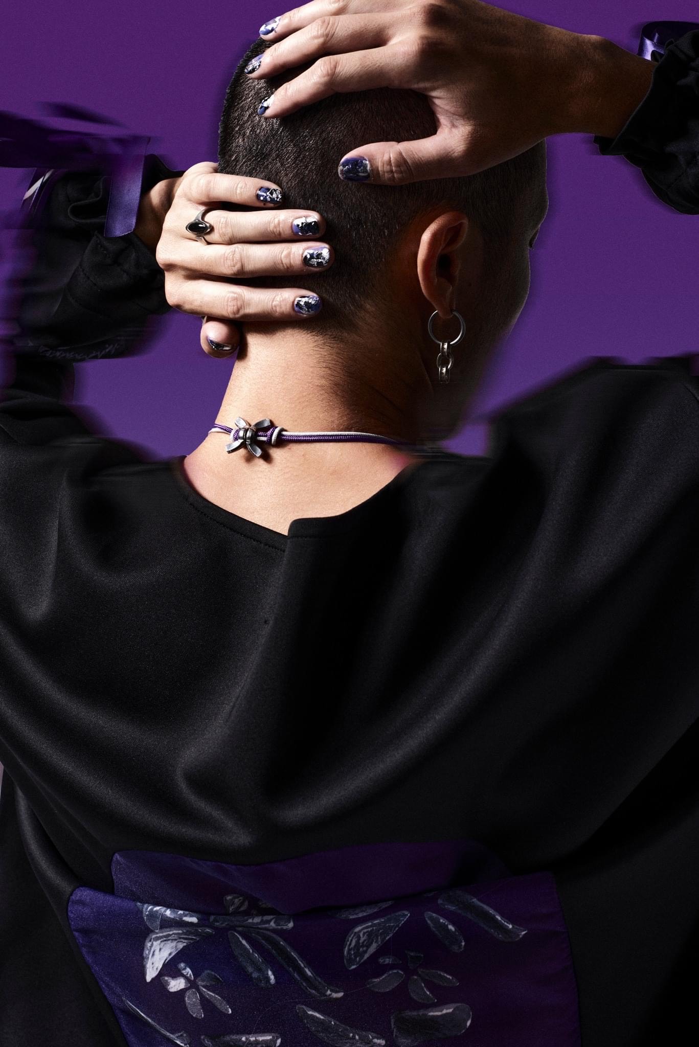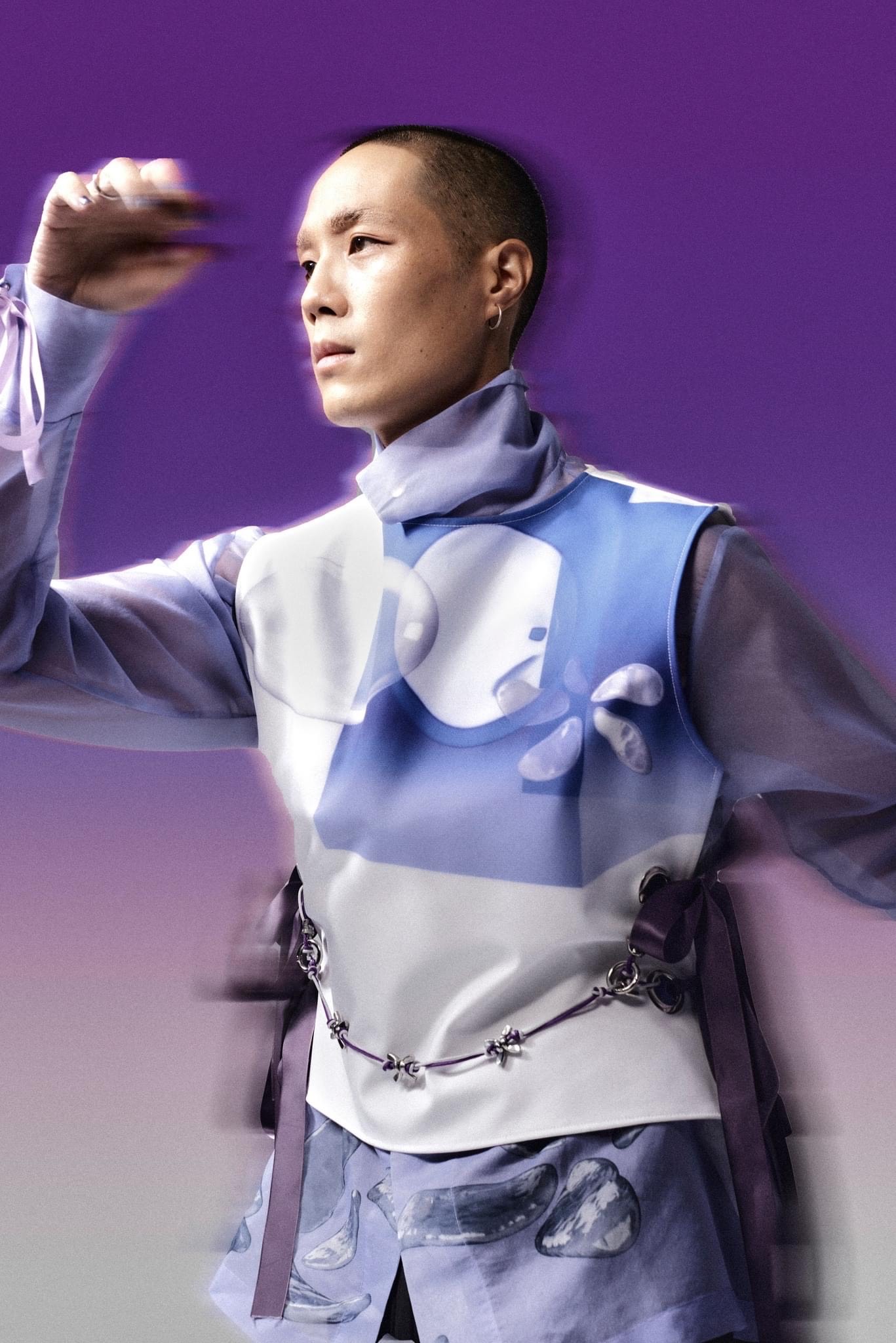 Hình ảnh phi giới tính quen thuộc vẫn hiện hữu nhưng lần này đã “chia sân” cho chất liệu kim loại, kết hợp chơi đùa giữa những lớp lang (layer) chất liệu dày mỏng để tạo nên một sự thử nghiệm mới mẻ của một hình tượng tương phản và gai góc hơn. Trọng tâm của graphic trên các thiết kế là hình ảnh giọt nước trong quá trình chuyển đổi thành bông hoa. Hoa lá chính là ngôn ngữ chủ đạo thường thấy ở các BST của ELENA NGN; và để tạo nên sự mới lạ, Trí Hà mong muốn đẩy đến cực hạn cảm giác của sự mong manh của những cánh hoa bằng việc tạo nên hiệu ứng hoạ tiết kết tinh (crystalise), khiến chúng như đang ở ranh giới của tồn tại và tan biến nhằm thể hiện ý niệm về tính bất tử và vĩnh hằng.