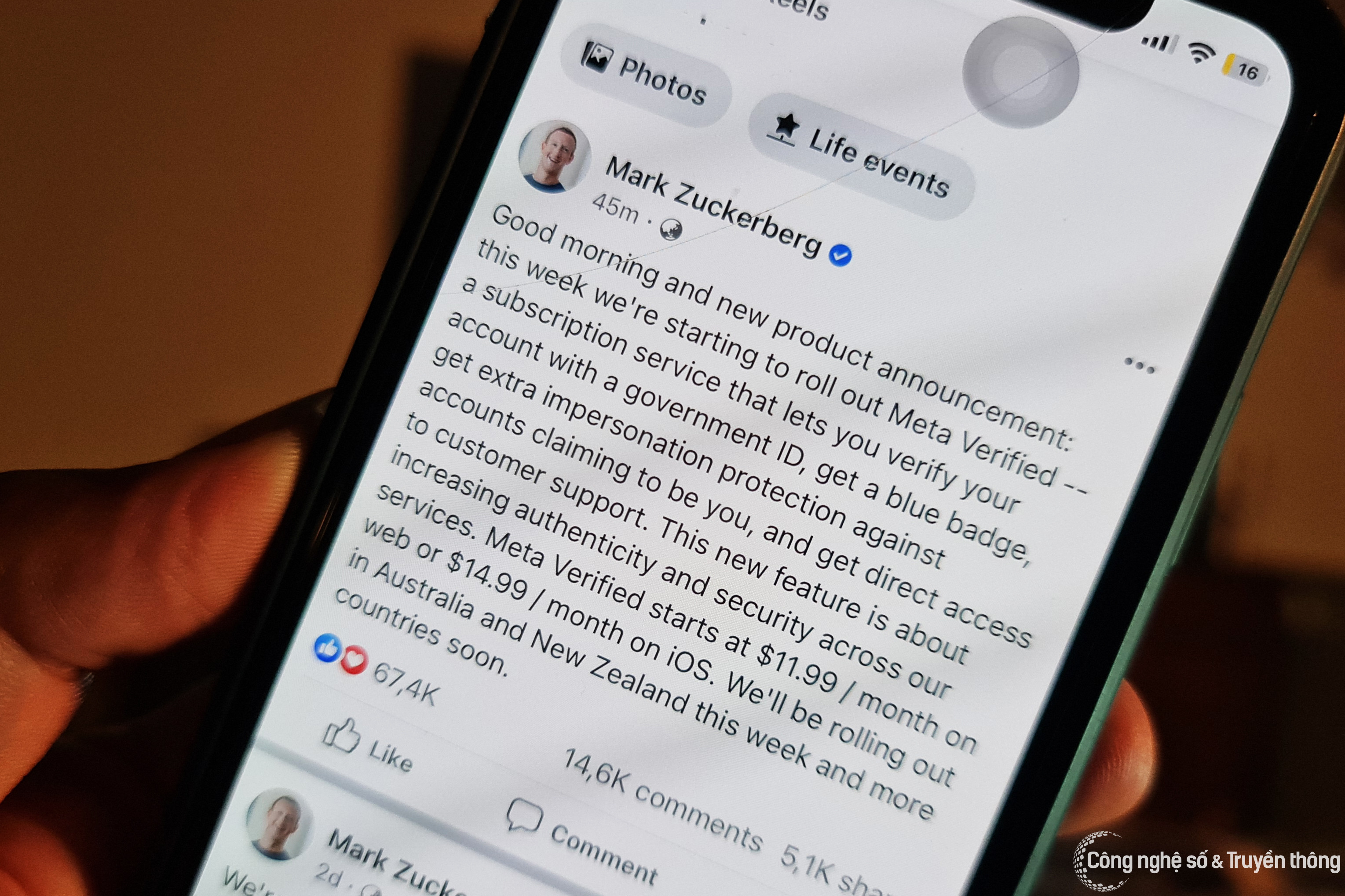 Mark Zuckerberg, CEO Meta, thông báo công ty sẽ thu phí tích xanh trên các nền tảng mạng xã hội là Facebook và Instagram. Dịch vụ mới sẽ mang tên Meta Verified, có giá 11,99 USD (280.000 đồng) mỗi tháng khi đăng ký trên website. Nếu đăng ký thông qua ứng dụng iOS, người dùng phải trả 14,99 USD mỗi tháng.