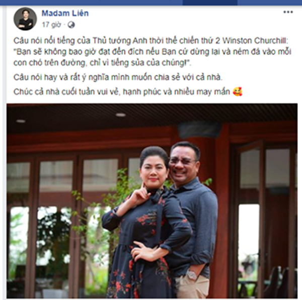Theo đó, trên trang Facebook cá nhân có tên Madam Liên viết: "Câu nói nổi tiếng của Thủ tướng Anh thời thế chiến thứ 2 Winston Churchill: "Bạn sẽ không bao giờ đạt đến đích nếu Bạn cứ dừng lại và ném đá vào mỗi con chó trên đường, chỉ vì tiếng sủa của chúng!".