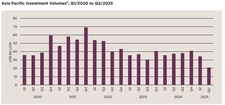 Khối lượng đầu tư bất động sản tại Châu Á – Thái Bình Dương từ quý I/2020 đến quý II/2025 – Nguồn: Báo cáo Savills APIQ Q2/2025