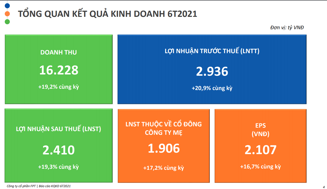 Theo thông tin từ CTCP FPT (MCK: FPT), 6 tháng đầu năm, công ty ghi nhận doanh thu 16.228 tỷ đồng, lợi nhuận trước thuế 2.936 tỷ đồng; lần lượt tăng 19,2% và 21% so với cùng kỳ năm ngoái.