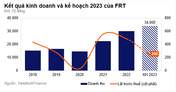 Tại ĐHĐCĐ, FRT thông tin về kế hoạch doanh thu 2023. Cụ thể, doanh thu mục tiêu 2023 của FRT ở mức 34 ngàn tỷ đồng, tăng 13% so với thực hiện năm 2022. Nhưng lãi trước thuế mục tiêu chỉ 240 tỷ đồng, giảm 51% so với cùng kỳ.