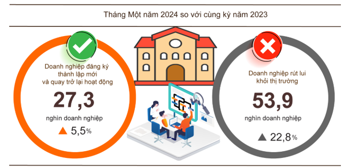 Theo báo cáo của Tổng cục Thống kê, khoảng 53.900 doanh nghiệp đăng ký tạm ngừng kinh doanh, làm thủ tục giải thể; nhiều gấp đôi số doanh nghiệp mới gia nhập thị trường trong tháng đầu tiên năm 2024.