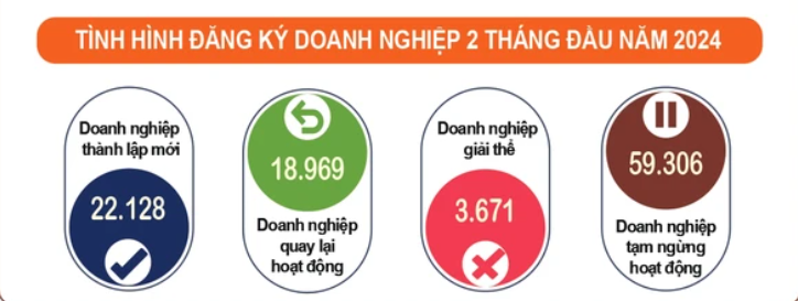 Tính chung 2 tháng đầu năm 2024, cả nước có 41.100 doanh nghiệp đăng ký thành lập mới và quay trở lại hoạt động. Tuy nhiên, số doanh nghiệp rời khỏi thị trường vẫn cao hơn thành lập mới.