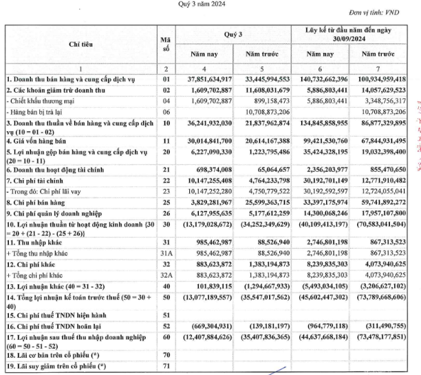 Lũy kế 9 tháng, SCD có gần 135 tỷ doanh thu, gấp rưỡi so với cùng kỳ năm trước. Công ty lỗ sau thuế gần 45 tỷ đồng, giảm gần 40%. Lỗ lũy kế của SCD tính đến ngày 30/09/2024 gần 246 tỷ đồng, kéo vốn chủ sở hữu âm hơn 56 tỷ đồng.