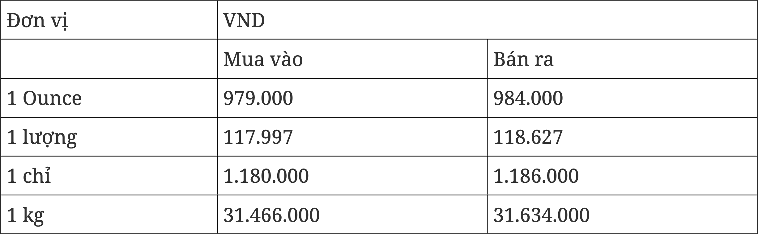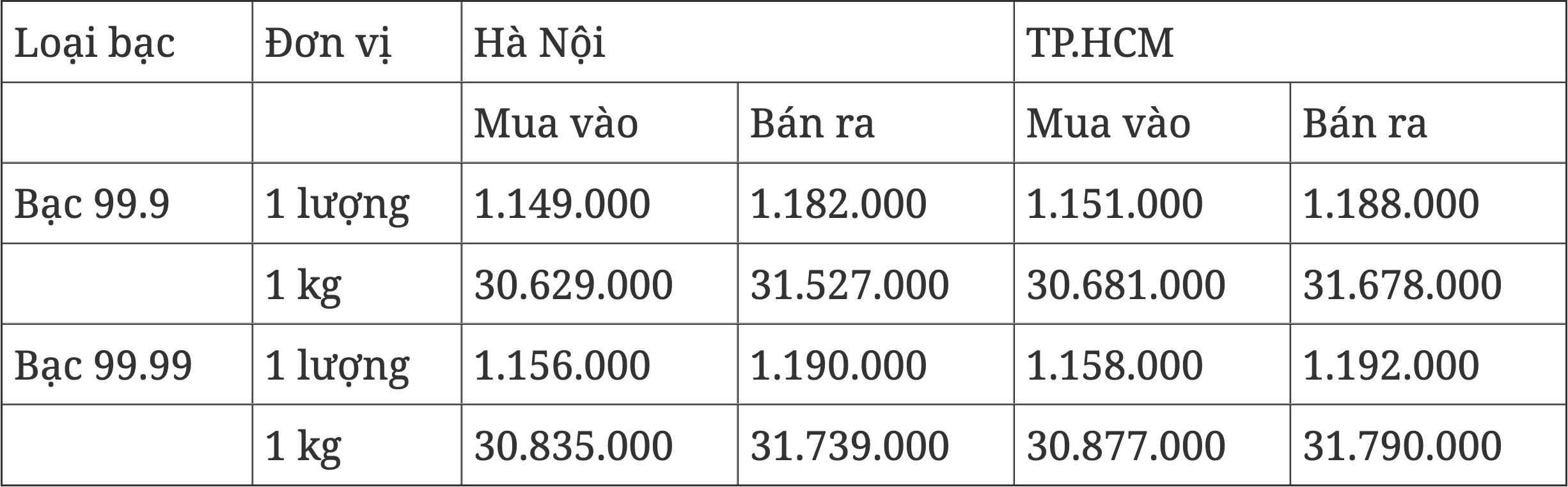 Tại TP. Hồ Chí Minh, giá bạc ổn định, hiện ở mức 1.151.000 đồng/lượng (mua vào) và 1.188.000 đồng/lượng (bán ra).