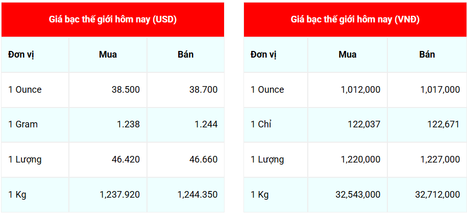 Trên thị trường thế giới, theo giabac.net, tại thời điểm 05:15:54 sáng 14/8, giá bạc giao ngay giao dịch tại mốc 38,526 USD/ounce, tăng 0,592 USD/ounce so với phiên giao dịch ngày 13/8.