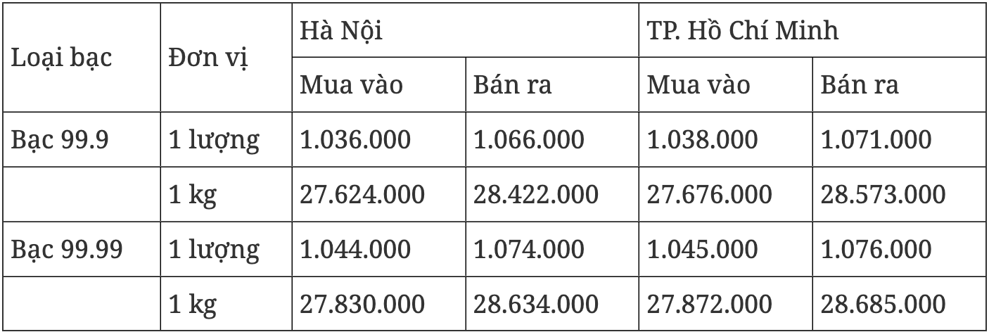Cũng tại Hà Nội, theo khảo sát tại các địa điểm giao dịch khác, giá bạc trong nước không thay đổi cả chiều mua và bán, hiện được niêm yết ở mức 1.036.000 đồng/lượng (mua vào) và 1.066.000 đồng/lượng (bán ra), tăng 10.000 đồng/lượng cả ở chiều mua và bán so với phiên giao dịch sáng hôm qua.