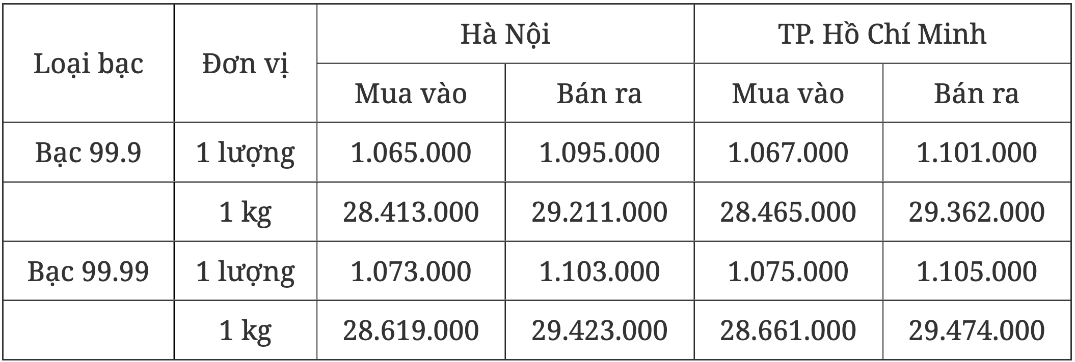 Thông tin mới nhất về giá bạc tại Hà Nội và TP. Hồ Chí Minh ngày 26/4/2025:
