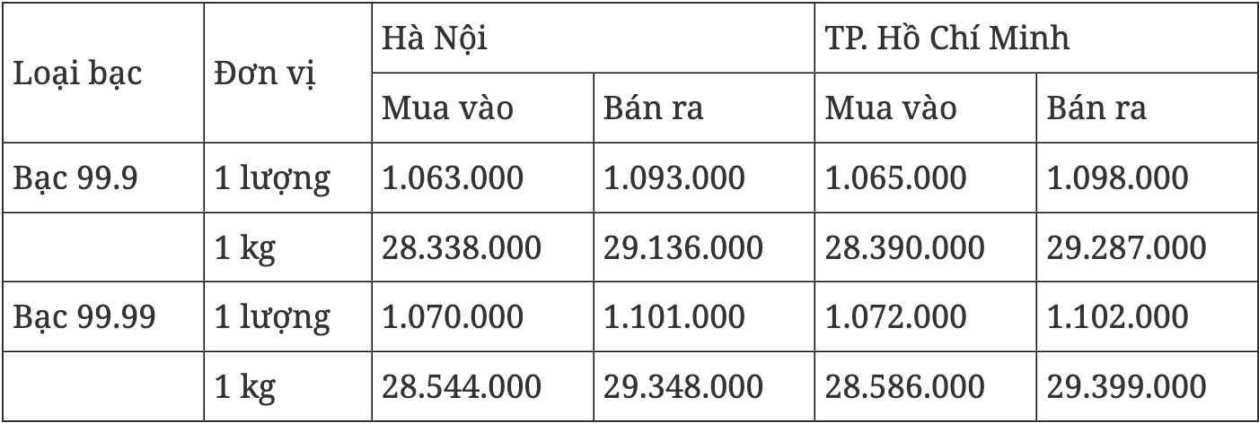 Tương tự, tại TP. Hồ Chí Minh, giá bạc cùng xu hướng giảm, hiện niêm yết tại mốc 1.065.000 đồng/lượng (mua vào) và 1.098.000 đồng/lượng (bán ra), giảm 2.000 đồng/lượng cả chiều mua và bán so với phiên giao dịch sáng hôm qua.