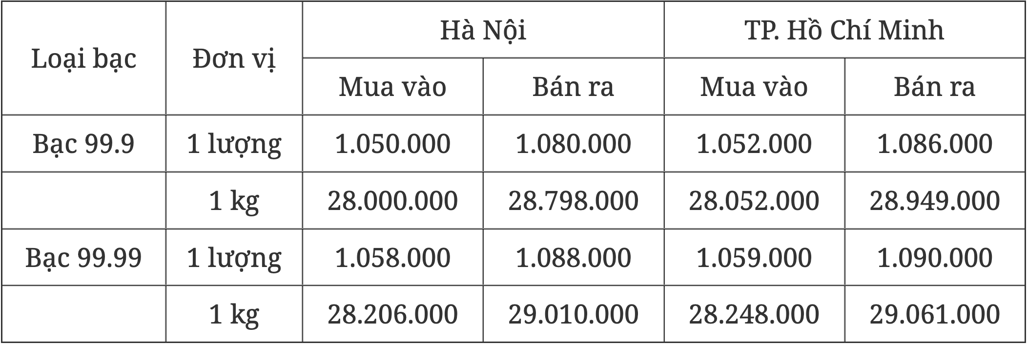 Thông tin mới nhất về giá bạc tại Hà Nội và TP. Hồ Chí Minh ngày 29/4/2025: