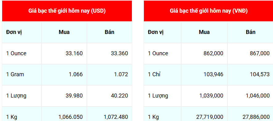 Trước đó, giá bạc niêm yết trên Goldprice.org ở ngưỡng 32,69 USD/ounce; giảm 0,37 USD so với phiên trước. Hiện ở mức giá 862.000 đồng/ounce (mua vào) và 867.000 đồng/ounce (bán ra).