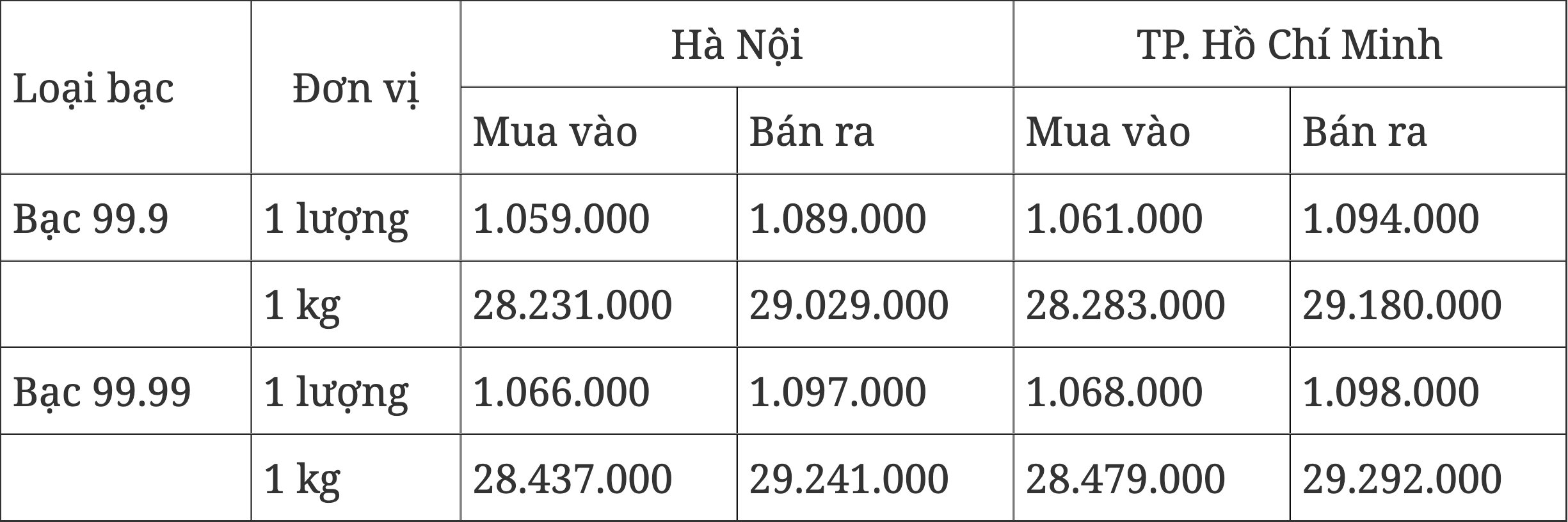 Thông tin mới nhất về giá bạc tại Hà Nội và TP. Hồ Chí Minh ngày 30/4/2025: