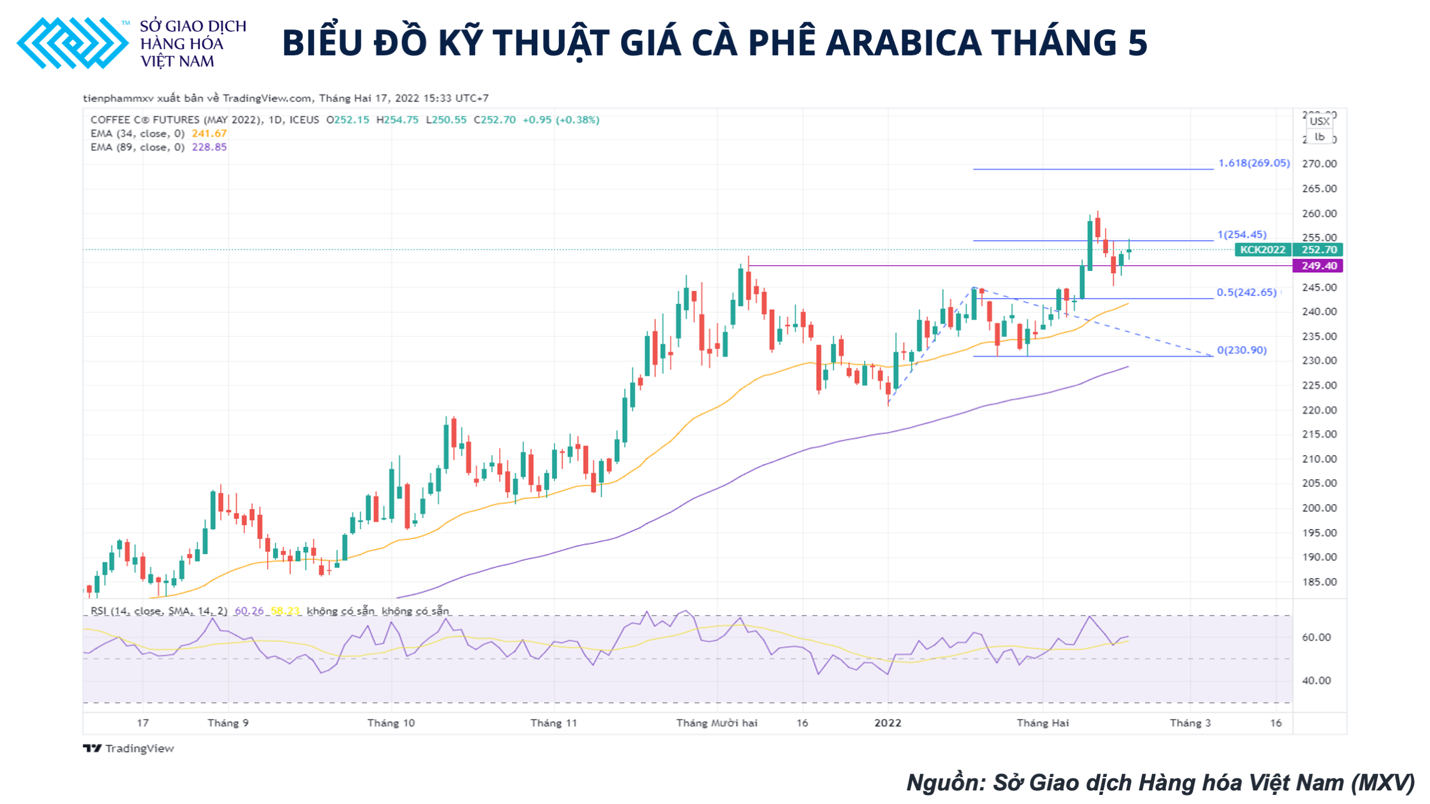 Biểu đồ kỹ thuật giá cà phê Arabica tháng 5 (Nguồn: Sở giao dịch Hàng hóa Việt Nam)