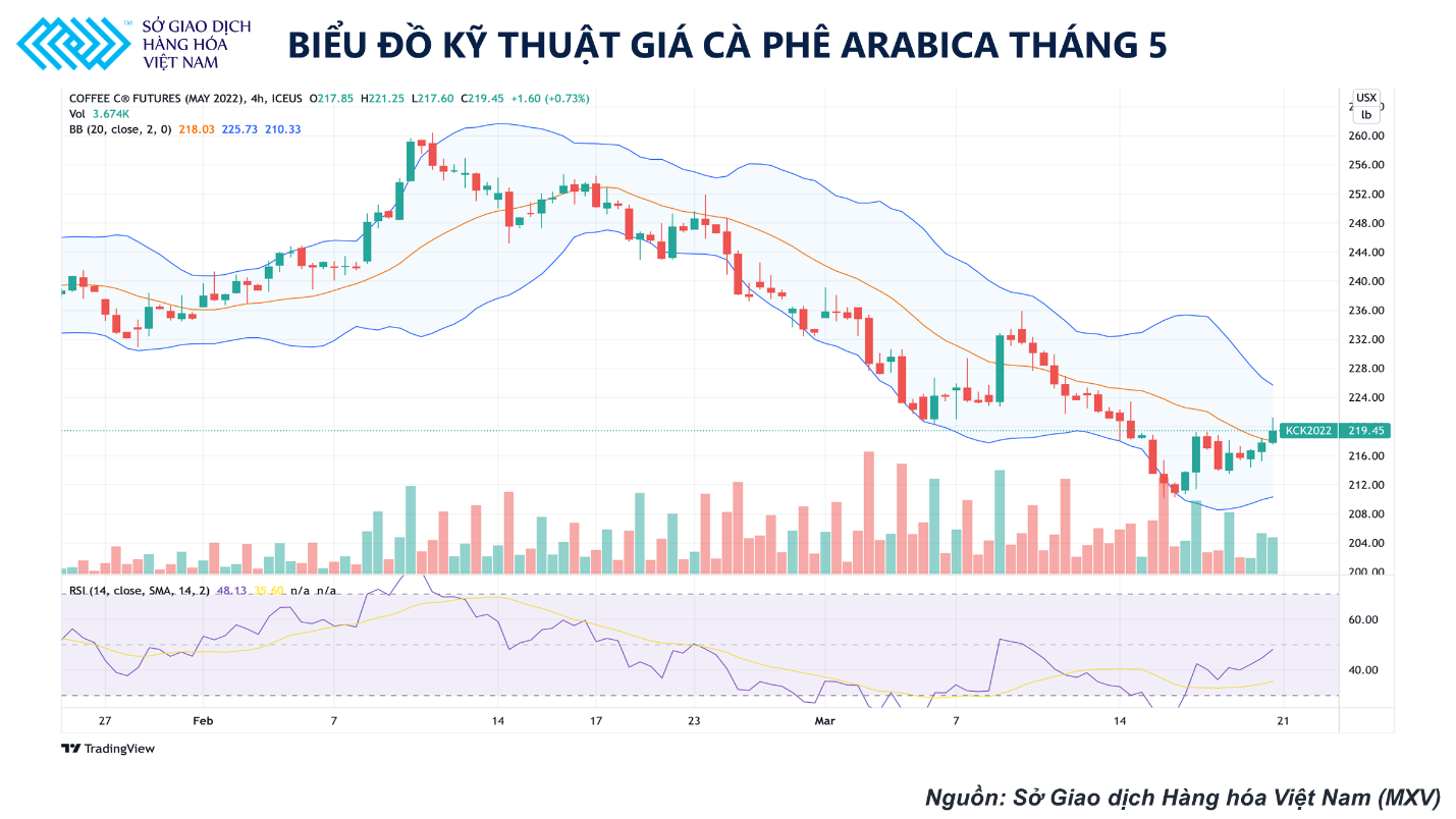 Biểu đồ kỹ thuật giá cà phê Arabica tháng 5 (Nguồn: Sở giao dịch Hàng hóa Việt Nam)
