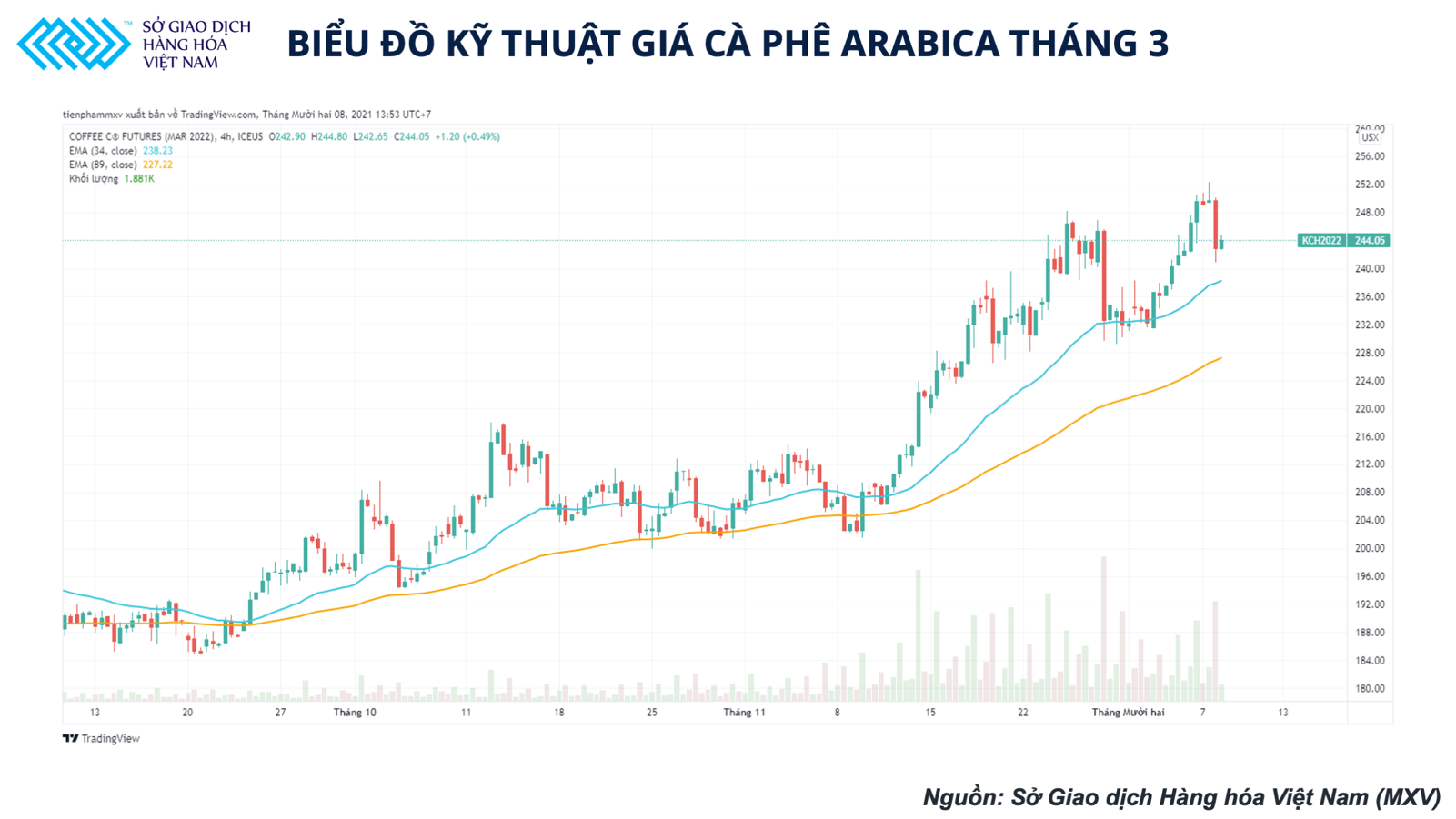 Biểu đồ kỹ thuật giá cà phê Arabica tháng 3 (Nguồn: Sở giao dịch Hàng hóa Việt Nam)