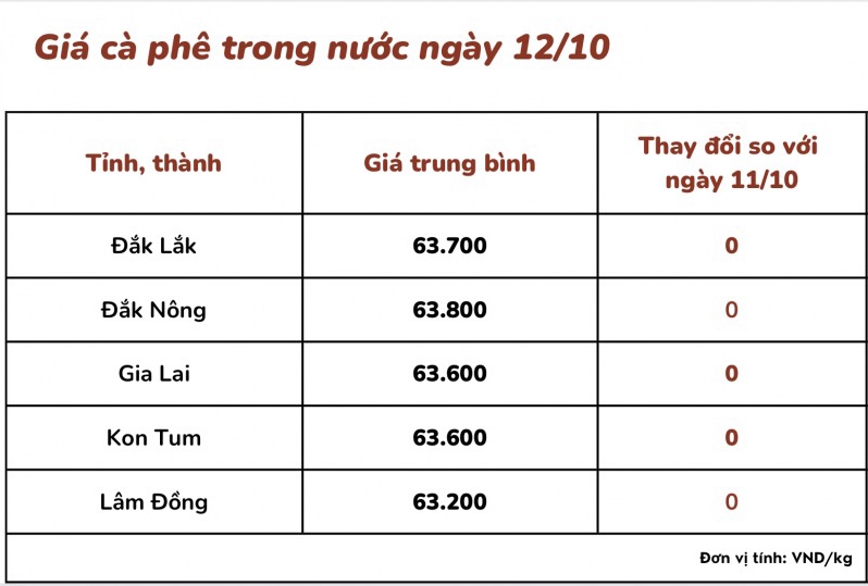 Giá cà phê trong nước hôm nay (12/10) vẫn ở duy trì ở mức đi ngang so với phiên giao dịch ngày 11/10, hiện giá cà phê trung bình tại các tỉnh Tây Nguyên về quanh mốc 63.600 đồng/kg.