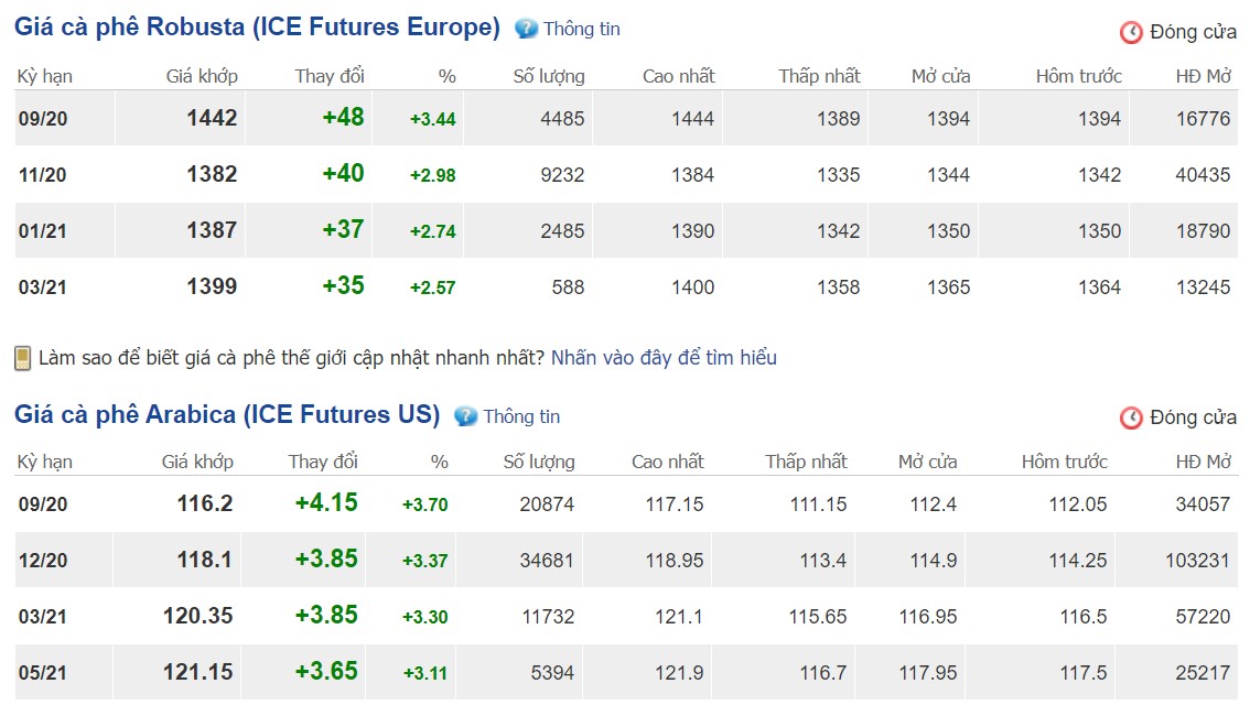 Trong phiên giao dịch sáng nay (giờ Việt Nam), giá tại 2 sàn giao dịch trên thế giới đồng loạt tăng mạnh. Giá cà phê Robusta tại London tăng 40 USD/tấn (2,98%) giao tháng 11/2020 giao dịch ở mức 1.382 USD/tấn. Sàn New York ở Mỹ, giá cà phê Arabica giao tháng 12/2020 tăng 3.85 cent/lb (3,37%) giao dịch ở mức 118.1 cent/lb.