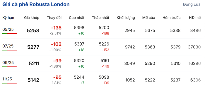 Trên Sàn giao dịch London, giá cà phê trực tuyến robusta hợp đồng giao tháng 5/2025 đóng cửa ở mức 5.253 USD/tấn, giảm 2,51% (135 USD/tấn) so với phiên giao dịch trước; hợp đồng giao tháng 7/2025 giảm 1,9% (102 USD/tấn), xuống còn 5.277 USD/tấn.