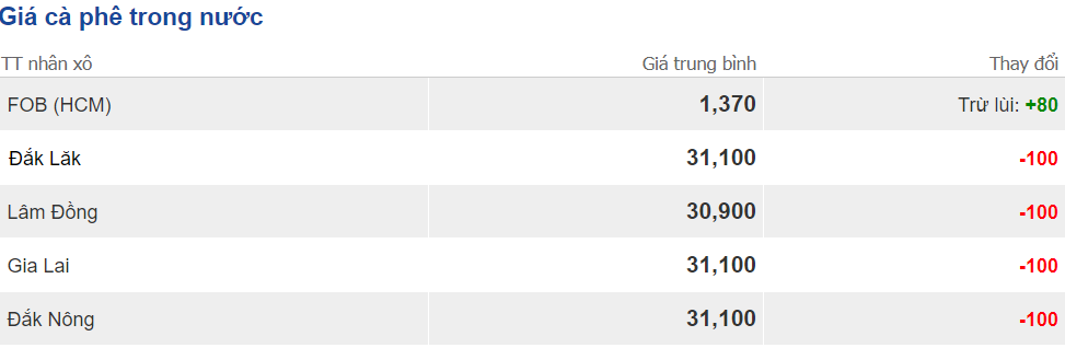 Giá cà phê tại Đắk Lắk đang giao dịch phổ biến ở mức 31.100 đồng/kg, giảm 100 đồng/kg so với hôm qua. Ở các địa phương như Đắk Hà thuộc Kon Tum, giá cà phê Robusta đang ở mức 31.100 đồng/kg, đây là các địa phương hiện đang có giá cà phê Robusta tốt nhất khu vực các tỉnh Tây nguyên.