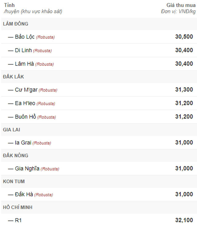 Giá cà phê hôm nay tại Tây Nguyên có nhiều nơi giảm 100 đồng/kg, nhiều nơi không đổi nhưng duy trì ở mức thấp nhất chưa từng có, chỉ đạt từ 30.400 - 31.000 đồng/kg. Thị trường hồ tiêu nguyên liệu cũng ảm đạm không kém, "lặng sóng" khoảng 2 tuần nay.