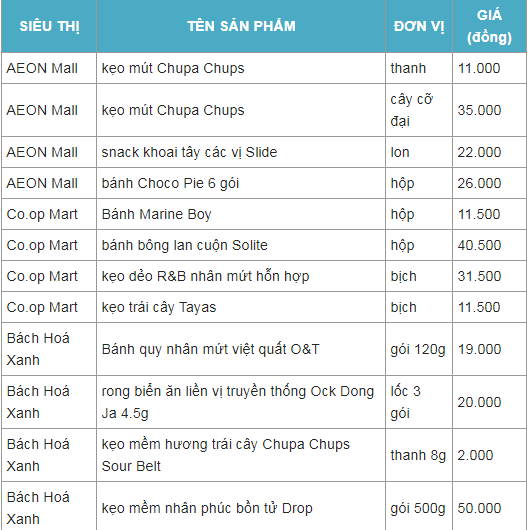 AEON Mall giảm giá bánh kẹo. Kitkat Mickey còn 11.000 đồng/thanh; kẹo mút Chupa Chups có giá 35.000 đồng/cây cỡ đại; snack khoai tây các vị Slide giảm còn 22.000 đồng/lon; bánh Choco Pie 6 gói giá 26.000 đồng/hộp…