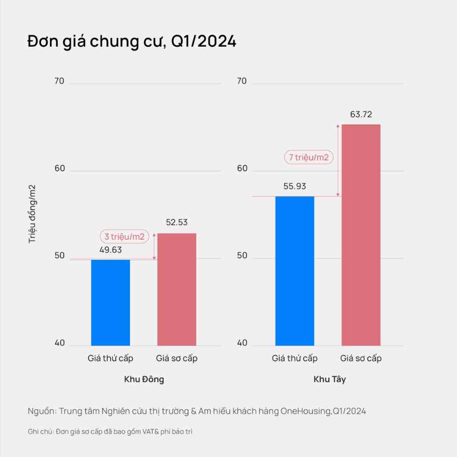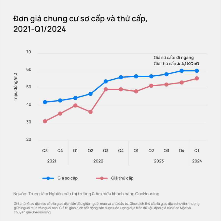 Trong điều kiện giá sơ cấp neo ở mức cao, thị trường thứ cấp cũng ghi nhận lượng giao dịch tăng trưởng và giá cũng đã có mức tăng so với giá trước đó. Thị trường thứ cấp trong thời gian trước cũng có mặt bằng giá hợp lý hơn so với giá sơ cấp, tuy nhiên trước nhu cầu về nhà ở ngày một lớn, giá thứ cấp trong những tháng đầu năm 2024 đồng thời ghi nhận mức tăng.