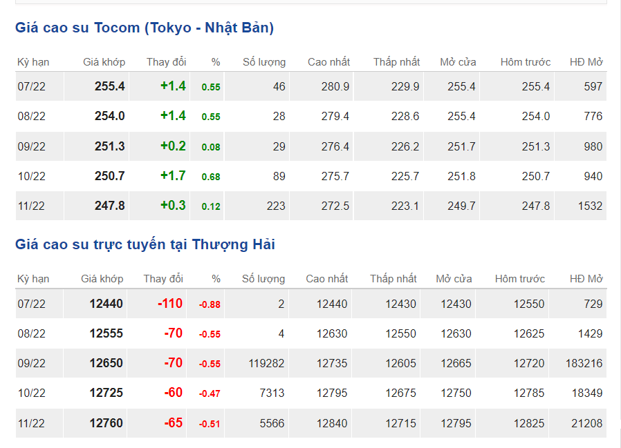 Tại Sở giao dịch hàng hóa Tokyo (TOCOM), giá cao su kỳ hạn giao tháng 7/2022 ghi nhận mức 255,4 yen/kg, tăng 0,55% (tương đương 1,4 yen/kg) tại thời điểm khảo sát vào lúc 6h30 (giờ Việt Nam).