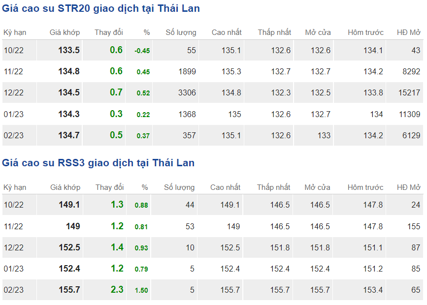 Cụ thể, giá cao su STR20 giao kỳ hạn tháng 10/2022 tăng 0,45% lên mức 133,5 Baht/kg; giao tháng 12/2022 tăng 0,52%, lên mức 134,5 Baht/kg.