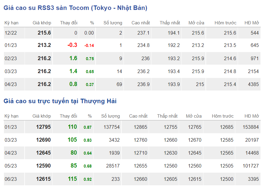 Giá cao su Thượng Hải hôm nay vẫn giữ đà tăng ở các kỳ hạn tháng 3/2023, tháng 4/2023, tháng 5/2023, tháng 6/2023 ở mức tăng gần 1%.