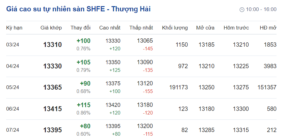 Trên Sàn giao dịch hàng hóa tương lai Thượng Hải (SHFE), giá cao su RSS3 giao kỳ hạn tháng 3/2024 được điều chỉnh lên mức 13.310 nhân dân tệ/tấn, tăng 0,76% (tương đương 100 nhân dân tệ) so với giao dịch.