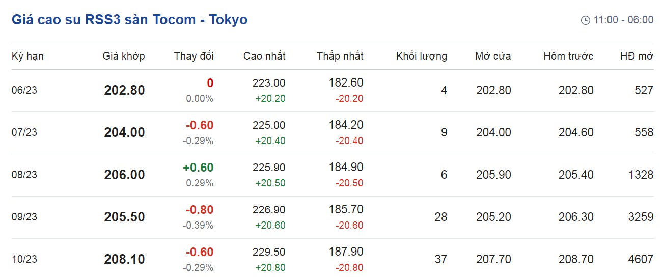 Tại Sở giao dịch hàng hóa Tokyo (TOCOM), giá cao su kỳ hạn giao tháng 6/2023 đạt mức 202,8 yen/kg, đi ngang tại thời điểm khảo sát vào lúc 7h15 (giờ Việt Nam).