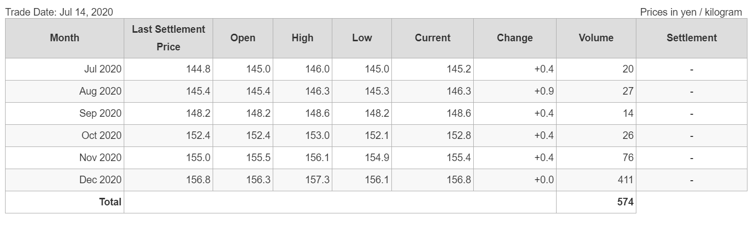Tại Sở giao dịch hàng hóa Tokyo (TOCOM), giá cao su ngày 14/7/2020 kỳ hạn tháng 12/2020 đang giữ giá ở mức 156,8 yen/kg.