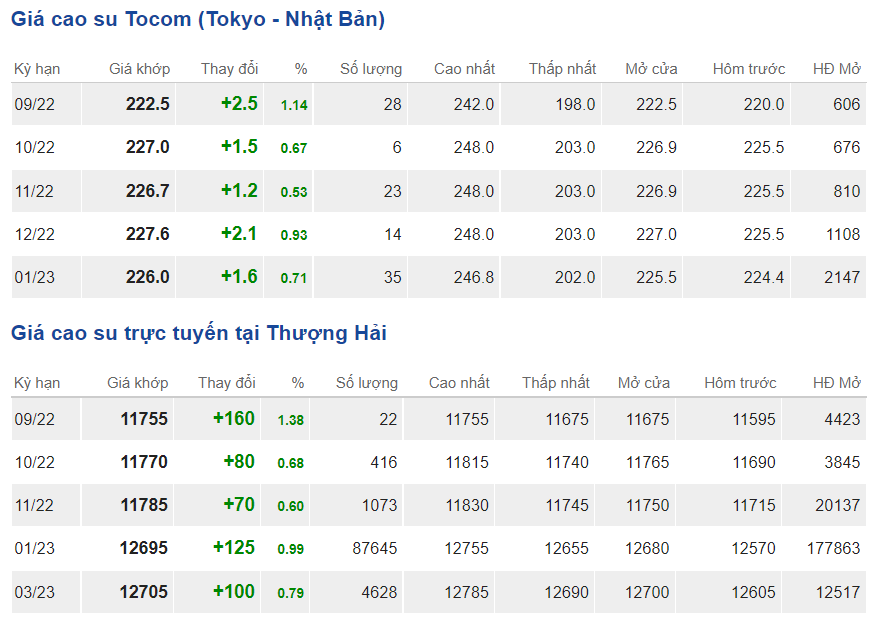 Tại Sở giao dịch hàng hóa Osaka Exchange (OSE), đầu tháng 9/2022, giá cao su giảm xuống mức 219,6 yen/kg vào ngày 7/9/2022, sau đó đã tăng trở lại, nhưng vẫn giảm so với cuối tháng 8/2022.