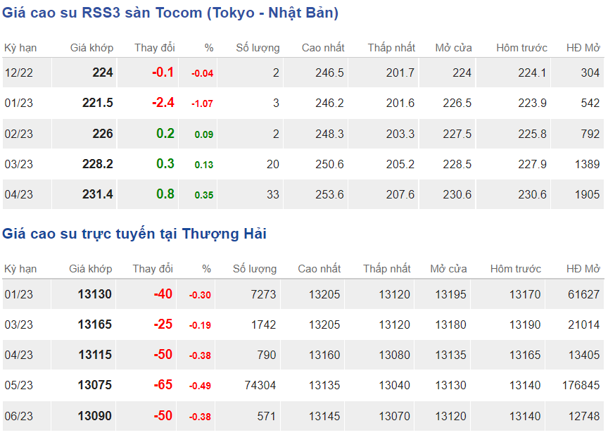 Trên Sàn giao dịch hàng hóa tương lai Thượng Hải (SHFE), giá cao su RSS3 giao kỳ hạn tháng 1/2023 được điều chỉnh xuống mức 13.130 nhân dân tệ/tấn, giảm 0,3% (tương đương 40 nhân dân tệ) so với giao dịch trước đó.
